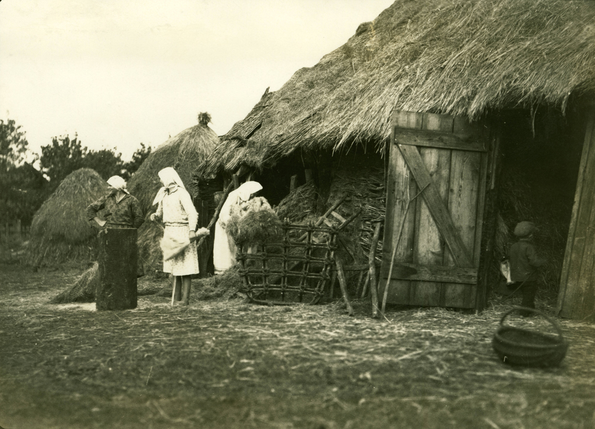 „Scheune und Getreidespeicher. Links bearbeiten zwei Frauen Flachs. Rechts eine hölzerne Egge. Ein Bündel Roggen. Diesen Leuten ging es gut. Sie waren sauber und die Kinder trugen gute Kleidung. Sie waren orthodox-griechische Katholiken, und ihre Kirche befand sich zwischen den Kiefern.“