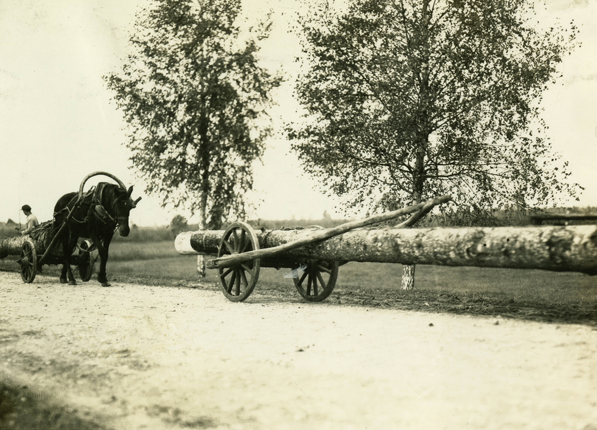 „42 Meilen östlich von Iwazewitschy. Wagen mit Holzstangen, die die Hinterräder verbinden und dazu dienen, das hintere Ende der langen Baumstämme zu lenken. Form einer Wünschelrute. Links die Vorderseite eines weiteren Wagens.“