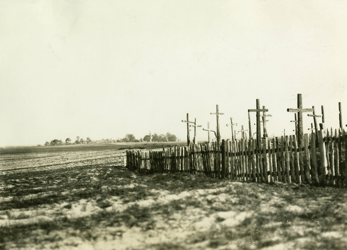 „Friedhof. Hohe unbemalte Kreuze ohne Namen oder Erkennungszeichen. Pflöcke markieren, wo die Toten begraben sind. Moos auf den Kreuzen.“