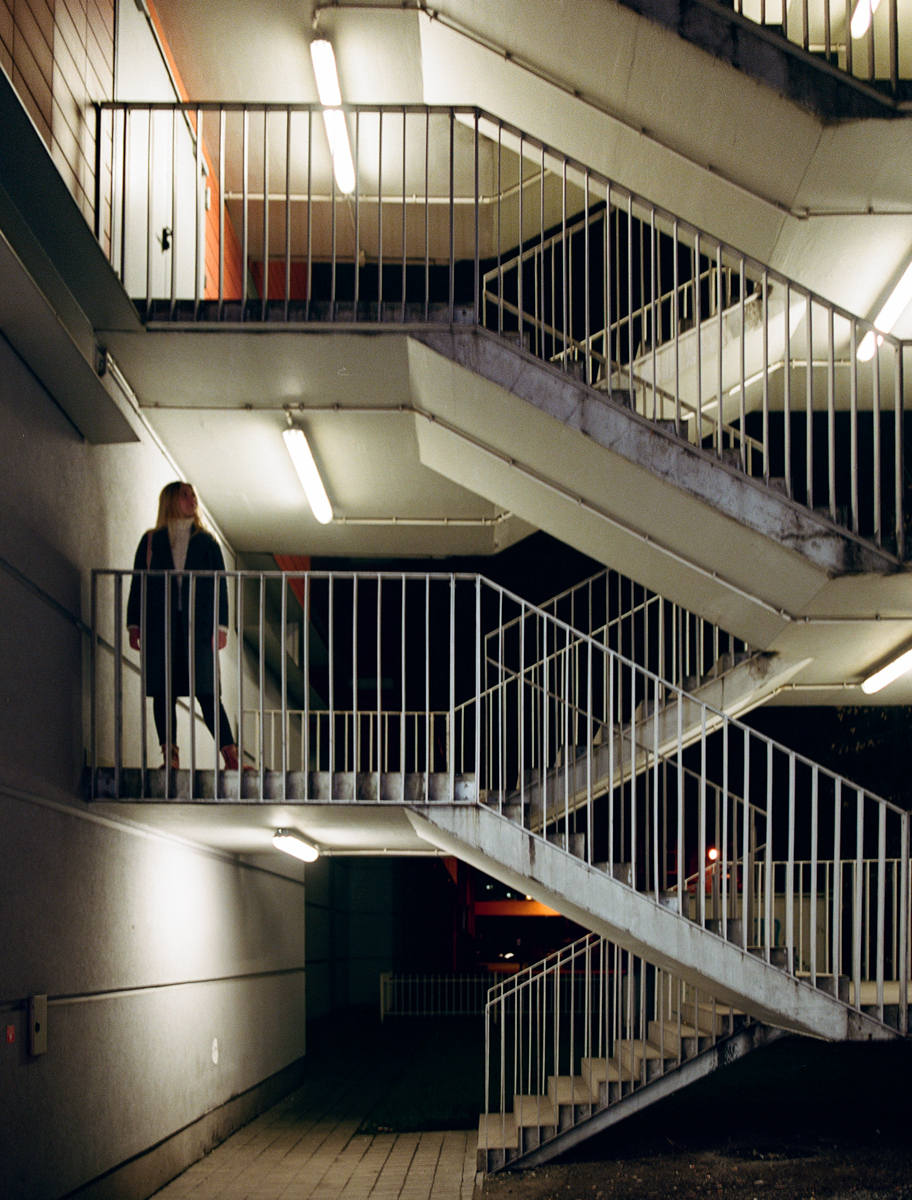 Eine junge Frau steht in einem Treppenhaus, auf Wände und Decken fällt kühlweißes Neonlicht, andere Bereiche liegen im Schatten, wo auch diese Frau steht, die nur schwer zu erkennen ist. Dieses eindrucksvolle Foto ist das Cover des Buches, das enstanden ist aus dem Projekt Connecting einer belarussischen Fotografin, die anonym bleiben möchte. Das Foto steht metaphorisch für die Schwierigkeiten des Ankommens in einem anderen Land, an einem fremden Ort, für das Dazwischensein, in dem Migranten leben, für die Suche nach lichten Orten, die einem helfen anzukommen, sich selbst zu finden in einer neuen Umgebung.