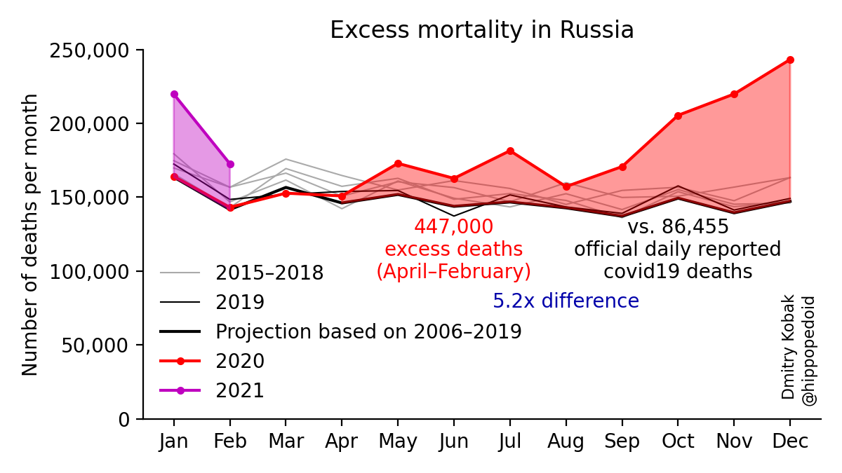 Mitte Februar 2021, als er das sagte, lagen die Sterberaten für das Jahr 2020 in Russland und anderen Ländern bereits vor. Den Zahlen nach war Russland weltweit einer der Außenseiter in diesem Kampf: Im vergangenen Jahr starben in Russland 2.124.000 Menschen. Das sind 20 Prozent beziehungsweise 321.000 Menschen mehr, als es ohne Coronavirus gewesen wären. Es starben doppelt so viele wie nach offiziellen Angaben an dem Virus gestorben sind.