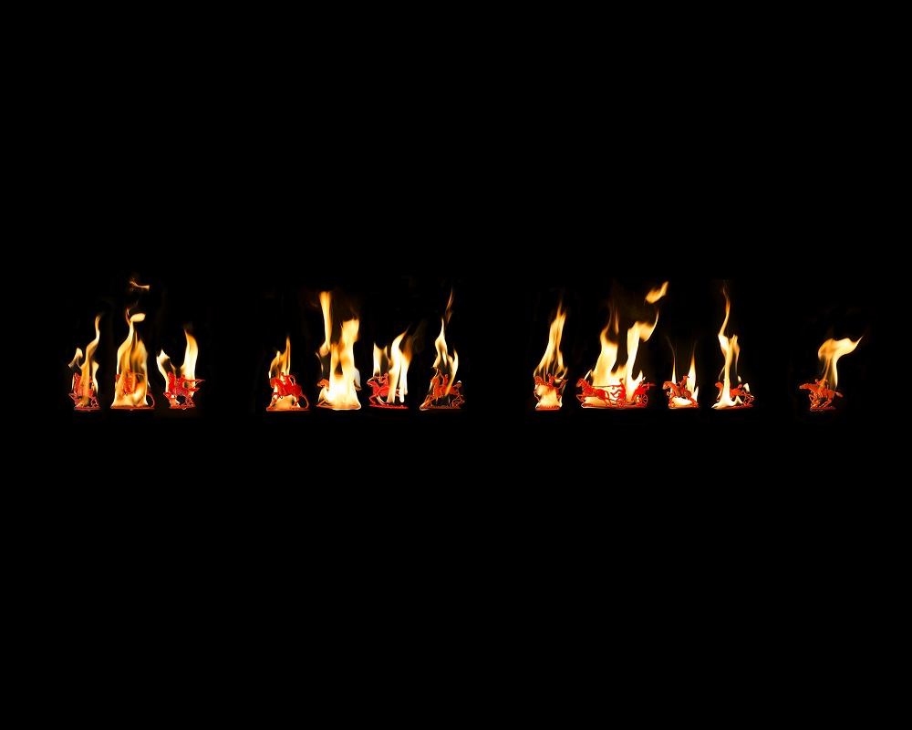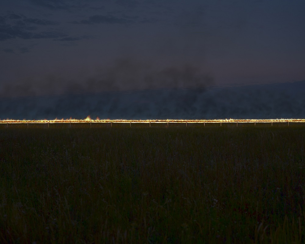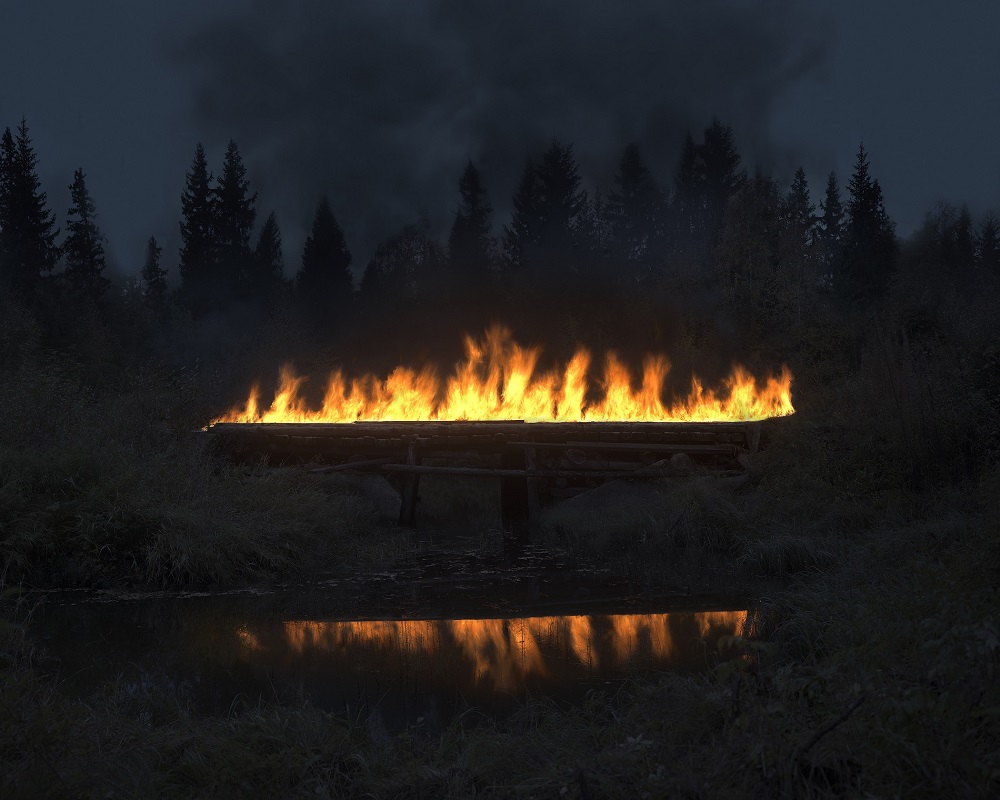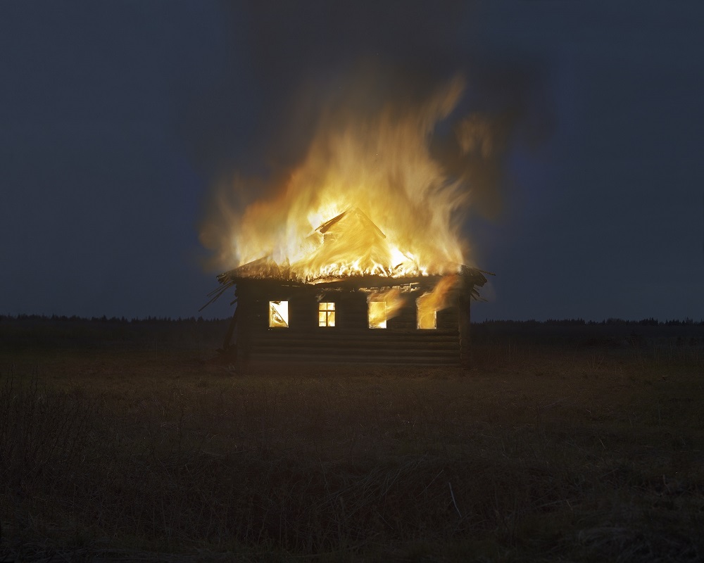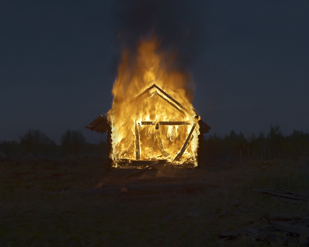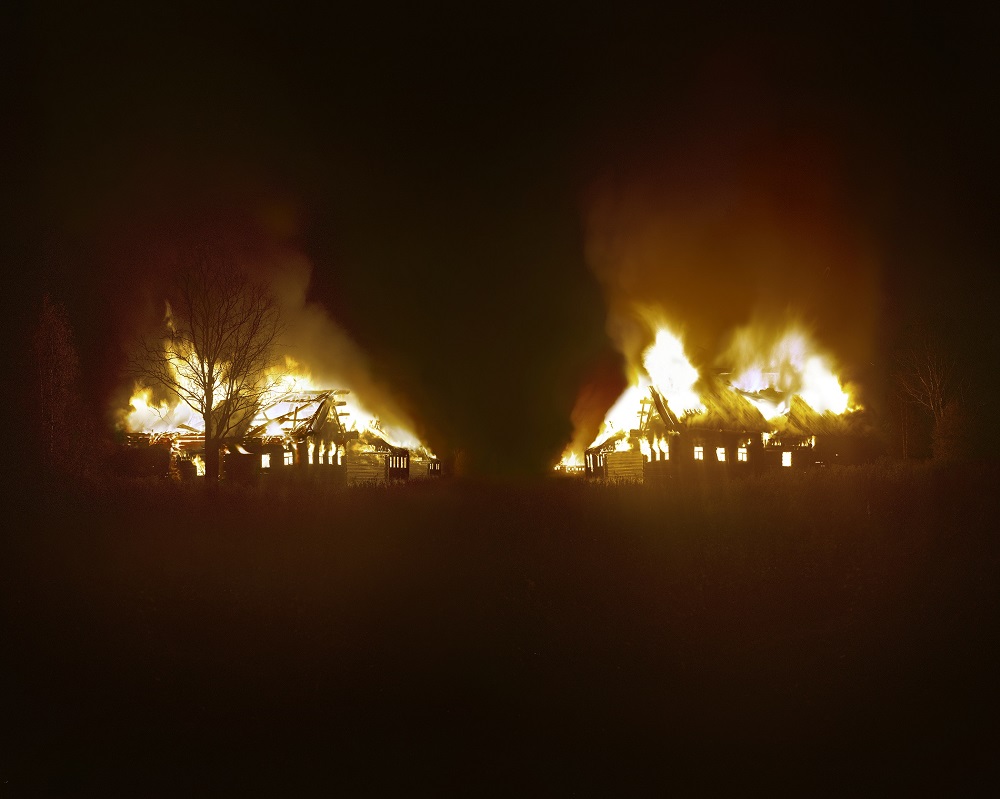 Seine neue Serie heißt Родина – Motherland. Sie ist wahrscheinlich seine radikalste. Tkachenko hat dafür alte Holzhäuser in Brand gesteckt. Außenrum Dunkel.