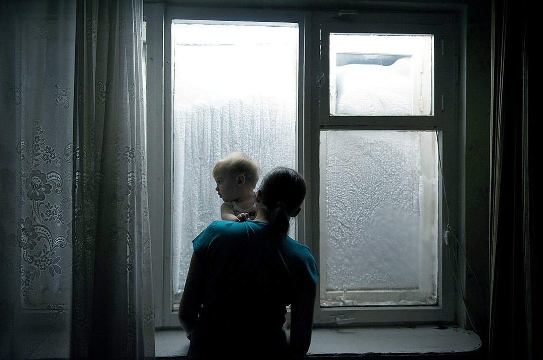 Eine Frau und ein Kind in ihrem Wohnzimmer. Während der kalten Monate geht ein Großteil des alltäglichen Lebens in geschlossenen Räumen vor sich, Dunkelheit und Kälte hindern die Menschen daran, sich für längere Zeit unter freiem Himmel aufzuhalten.