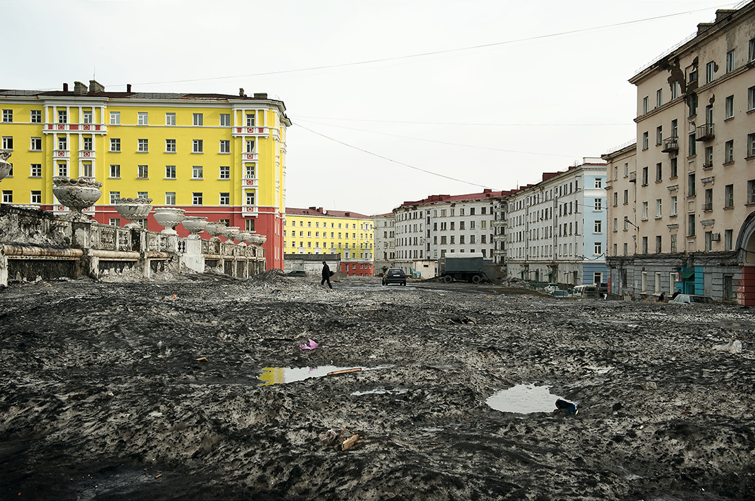 Zwar ist die Stadt Norilsk wohlhabend, dennoch verfallen viele Gebäude. Fast die ganze Stadt ist auf Pfeilern im Permafrost-Boden errichtet worden. Wenn die oberen Bodenschichten auftauen, werden die Verankerungen instabil, die Strukturen kommen in Bewegung, in tragenden Wänden tun sich große Risse auf. Viele Häuser sind unbewohnt und werden den Mächten der Witterung überlassen.