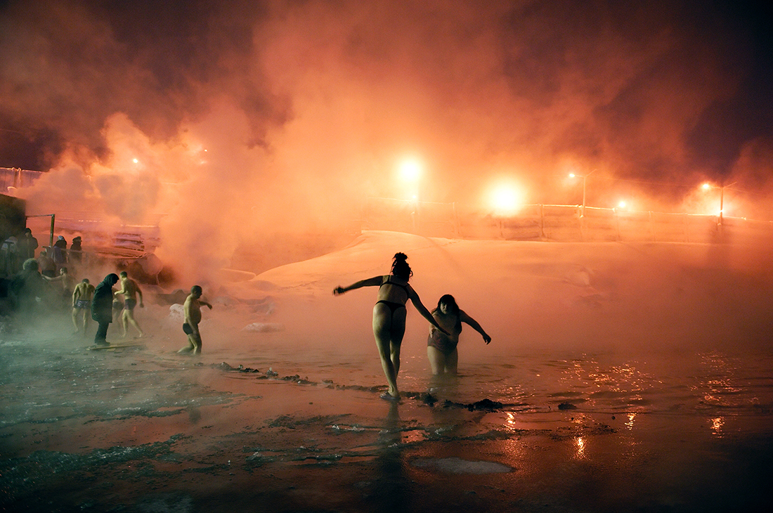 Eine der beliebtesten Winteraktivitäten ist das Eisbaden. Die Außentemperatur spielt keine Rolle, im Gegenteil: Je kälter es ist, desto mehr Menschen kommen an die Badestellen. Nach dem Badegang kann man sich in kleinen Banjas am Rand des zugefrorenen Sees wieder aufwärmen, die mit heißem Dampf aus dem Heizkraftwerk auf Temperatur gehalten werden.