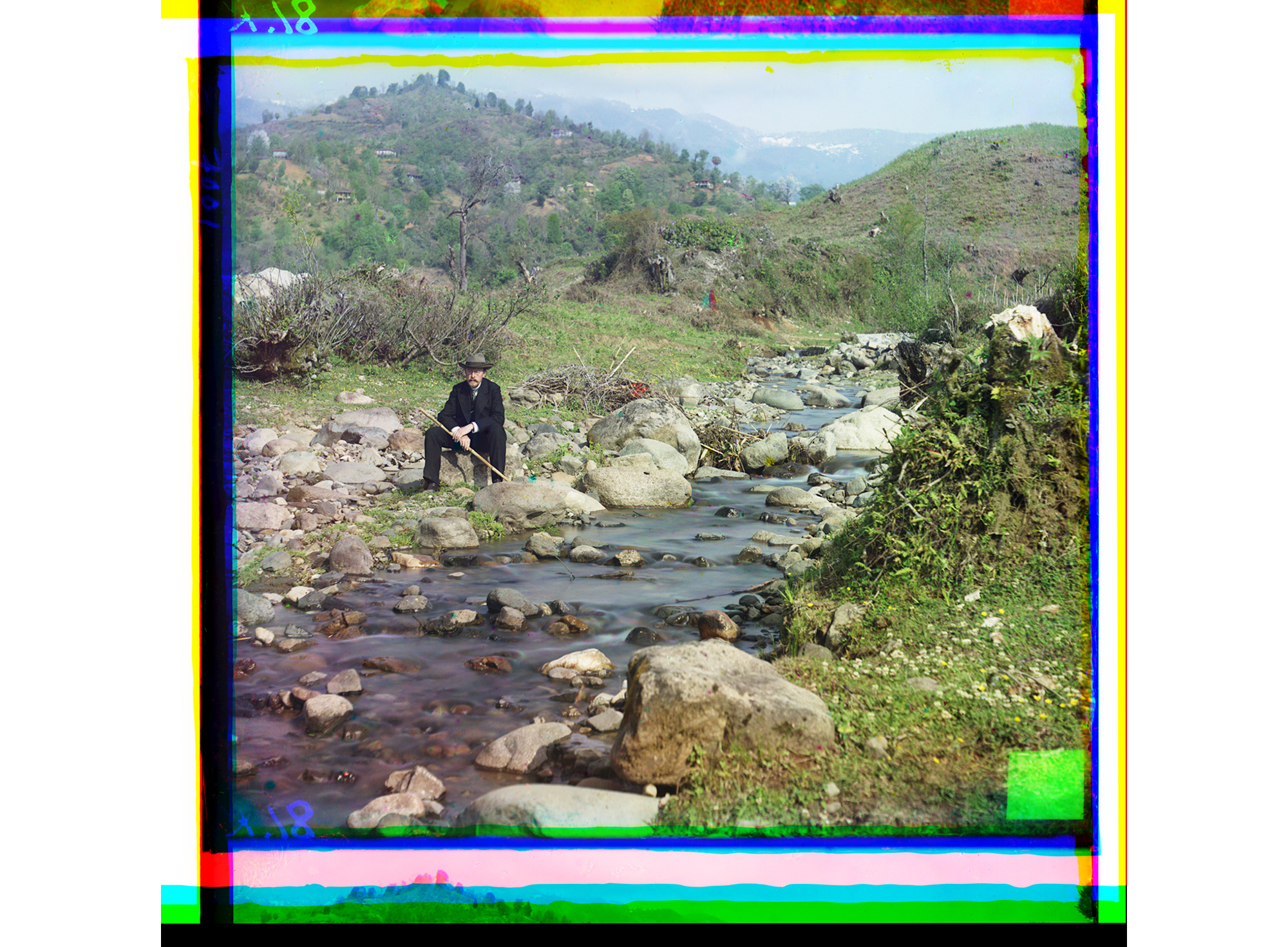 Oben: Selbstbildnis Sergej Michailowitsch Prokudin-Gorski am Flüsschen Skuritskhali, bei Batumi, Georgien, 1912