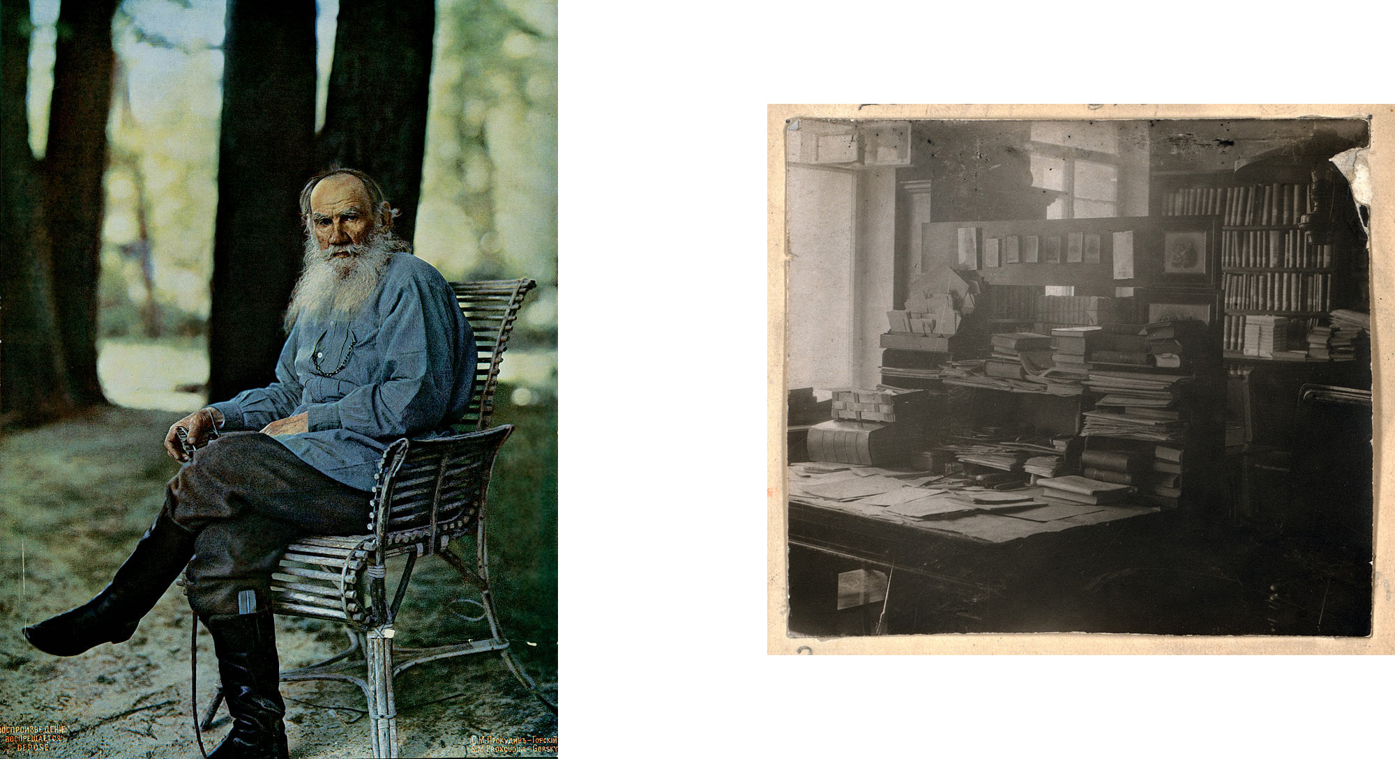 Rechts: Arbeitszimmer von L. N. Tolstoi in Jasnaja Poljana, 1908