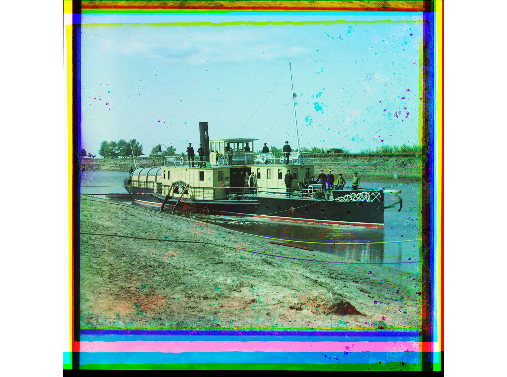 Diese additive Dreifarben-Fotografie bringt einige Besonderheiten mit sich, so scheint etwa ein bewegtes Objekt in verschiedenen Farben zu schillern – unten in der Fotoserie zu sehen beim Wasser auf dem Bild des Schleusenwärters Karlinski oder auch beim Gesicht eines der Besatzungsmitglieder des Dampfschiffs Scheksna. Hier finden sich weitere technische Details zu dieser längst vergessenen Fotografier-Methode.