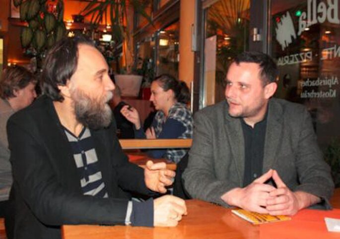 Es gibt noch eine italienische Zeitschrift für ultrarechte Intellektuelle, die Putin nach dem Prinzip „der Feind meines Feindes“ (Hauptsache, es geht gegen Amerika) unterstützen, und dort steht Engdahl beim wissenschaftlichen Beirat direkt in der Zeile unter Dugin. Man kann also davon ausgehen, dass Engdahl mit Dugin persönlich bekannt ist und über ihn Zugang hat zu den Köpfen und Büros der höchsten Führungsetagen, also auch zu den Chefs der staatlichen Fernsehgesellschaft WGTRK, dass er also nicht auf persönliche Initiative eines Jungredakteurs im russischen Äther auftaucht. Dugin nahestehende Kreise der europäischen Ultrarechten, Neonazis, Euroskeptiker und verschiedenste Verschwörungstheoretiker – das sind, wie es aussieht, die Hauptquelle, aus der das russische Fernsehen seine „Experten“ rekrutiert. Und nicht nur fürs Fernsehen. Da ist zum Beispiel Manuel Ochsenreiter, der regelmäßig sowohl auf RT als auch auf den russischen TV-Kanälen als „Journalist“ herumgeistert. Hier ist er beispielsweise in Gesellschaft von Alexander Dugin zu sehen:
