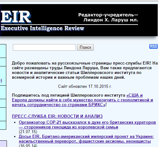 Ganz anders in Russland. Zum einen haben die LaRouchisten eine Niederlassung in Russland – das sogenannte Schiller-Institut. Und die Executive Intelligence Review hat auch eine russischsprachige Website. Dort steht genau das Gleiche wie im Original, bloß dass es in russischer Übersetzung noch hirnverbrannter wirkt: