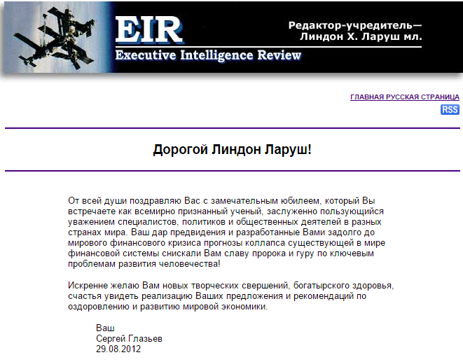 Und hier eine persönliche Gratulation von Sergej Glasjew an Lyndon LaRouche auf der russischen EIR-Seite: