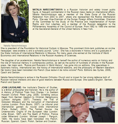 Heute wird Laughland als „Forschungsprogrammleiter des Instituts für Demokratie und Zusammenarbeit“ zitiert. Dieses hat seinen Sitz in Paris und nennt sich solide The Institute of Democracy and Cooperation oder auch Institut de la Démocratie et de la Coopération. Nur ist Leiter des Instituts nicht Laughland und auch nicht irgendein Monsieur Sowieso, sondern die ehemalige (2003–2007) russische Dumaabgeordnete für die Partei Rodina Natalja Narotschnizkaja, die von Putin persönlich zur Leiterin ernannt wurde.