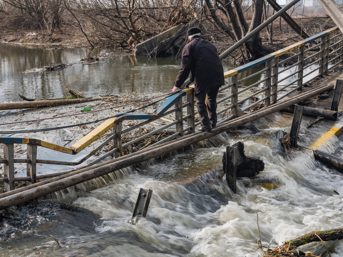 Eine Brücke über den kleinen Fluss – der kürzeste Weg aus dem Zentrum von Kyjiw in die bewaldete Vorstadt Irpin – wurde von ukrainischem Militär am zweiten Kriegstag gesprengt. Momentan ist das der einzige Weg aus der Vorstadt heraus, in der rund 60.000 Menschen leben. In alle anderen Richtungen steht die russische Armee, erinnert mit minütlichem Beschuss höflich an ihre Anwesenheit.
