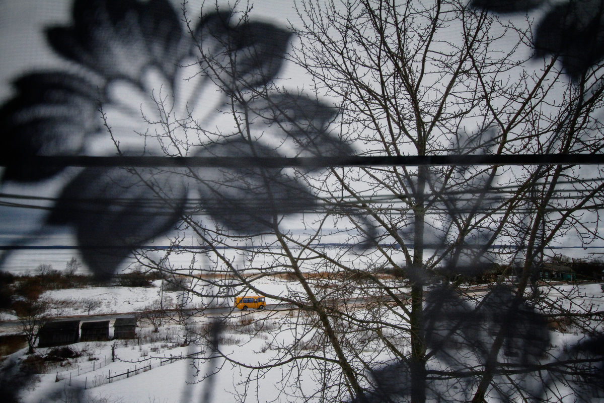 Der Blick aus einem Wohnungsfenster fällt auf einen Schulbus, der am winterlich eisbedeckten Aswejasee vorbei fährt / Foto © Siarhei Hudzilin