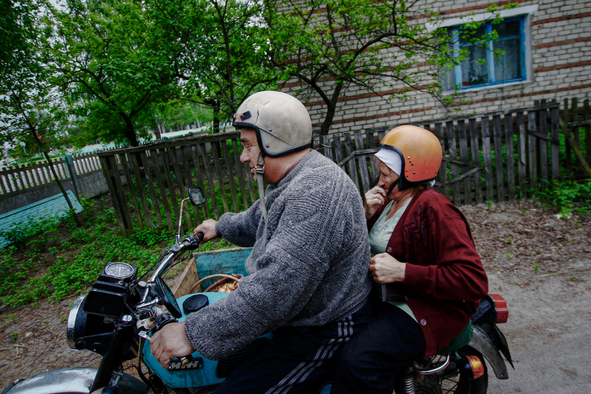 Straßenszene auf dem Land: Ein Ehepaar auf einem Motorrad / Foto © Siarhei Hudzilin