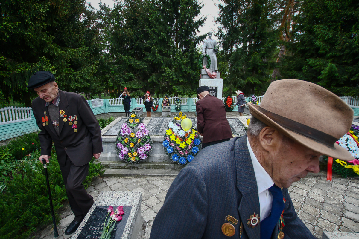 Veteranen des Großen Vaterländischen Krieges vor einem Gedenkstein im Stadtzentrum von Kamaryn – zum Tag des Sieges am 9. Mai / Foto © Siarhei Hudzilin