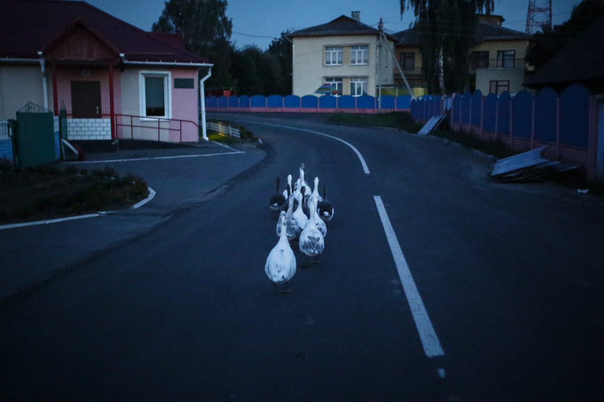 Eine Gänseschar auf der Hauptstraße des Agrogorodok Turow / Foto © Siarhei Hudzilin