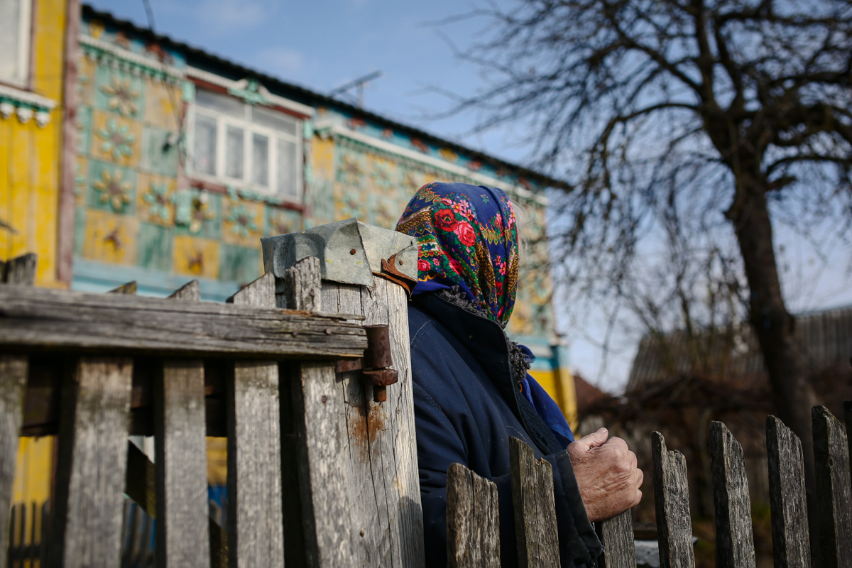Eine Frau am Zaun vor ihrem Haus in Chozimsk / Foto © Siarhei Hudzilin