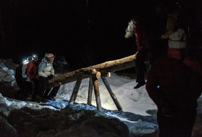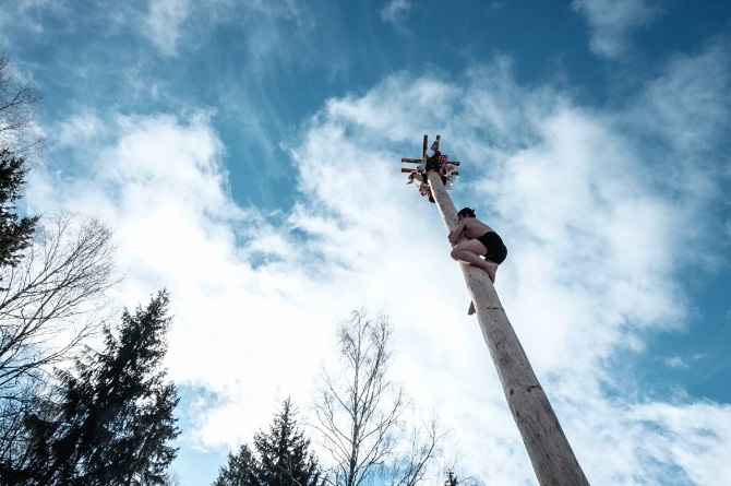 Der längste glattpolierte Baumstamm, etwa zehn Meter lang, wird später in der Mitte vom Feld aufgestellt. Er ist fester Bestandteil des Unterhaltungsprogramms einer jeden Masljaniza. Ganz oben werden Preise angebracht – für diejenigen, die es so weit hoch schaffen. Ich bekomme die Aufgabe, eine Wippe zu bauen. Dafür braucht es einen Baumstamm, Tannen und ein paar Feuerwehrschläuche.