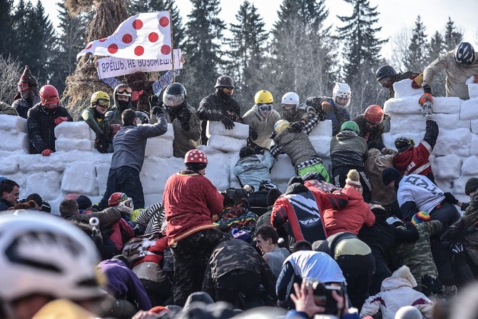 Schon bemerkt der Bär den Verlust, erobert die Puppe zurück und versteckt sie in der Schneefestung. Der Frühlings-Woiwode ruft zum Sturm auf die Festung. Sie wird von alteingesessenen Masljaniza-Teilnehmern verteidigt, die nicht davor zurückschrecken uns mit Schneebällen zu bewerfen oder von der steilen Mauer in den Schnee zu schmeißen.