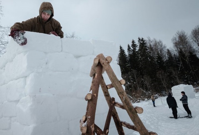 Vom Rand des gigantischen Feldes – mindestens so groß wie ein Fußballfeld – dringt das Heulen einer Motorsäge zu uns herüber. Die Butterbauarbeiter sägen Blöcke aus gepresstem Schnee für den Bau der Schneefestung – ein Bauwerk von mindestens fünf Metern Höhe, das an Masljaniza gestürmt werden soll, unter Anführung des Frühlings-Woiwoden. Aufgetürmt werden die Blöcke mithilfe eines Krans, der ist selbstgezimmert aus ein paar Baumstämmen, Seil und Segeltuch. Darin wird der Schnee mit den Füßen zusammengestampft und zersägt.