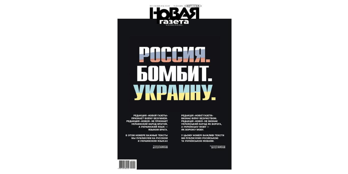 Einen Tag nach dem russischen Angriff auf die Ukraine erscheint die Novaya mit dieser Titelseite – die wegen der Zensurgesetze, die am 4. März von Putin unterschrieben wurden, im Archiv der Zeitung nur noch verpixelt zu sehen ist. Die Ausgabe erscheint zweisprachig – auf Russisch und Ukrainisch.