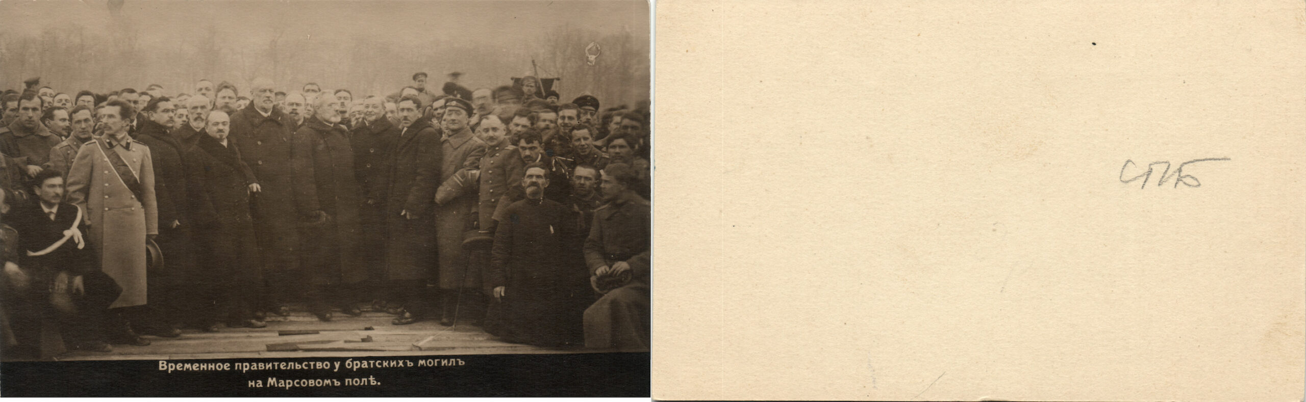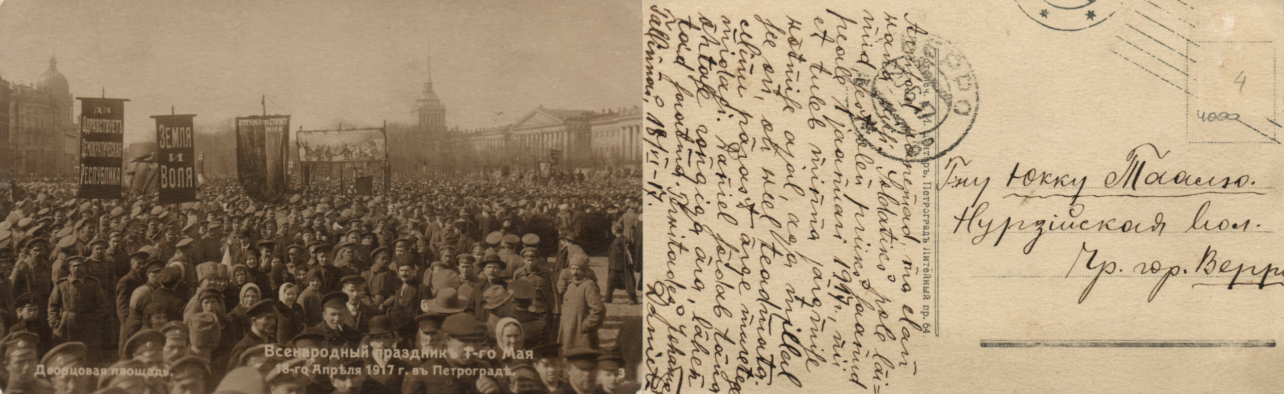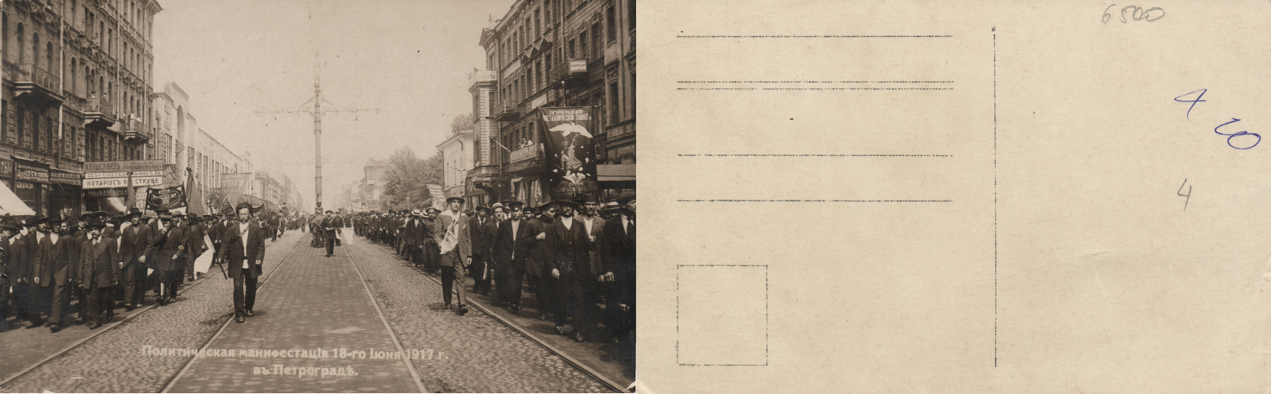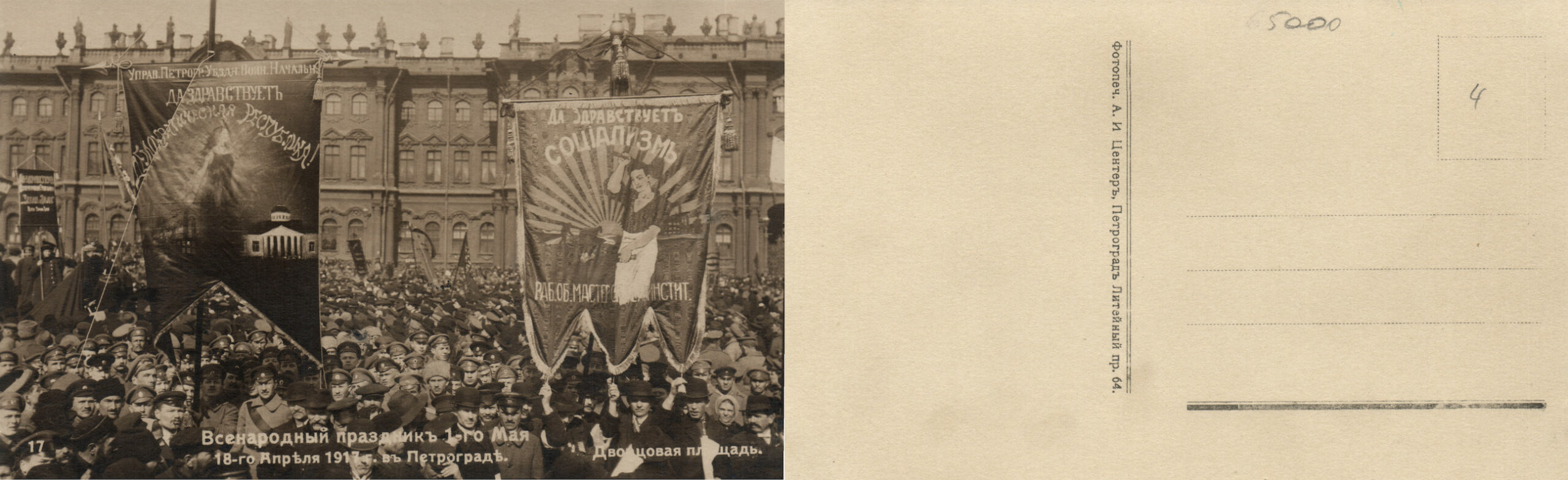 Der 1. Mai war der erste revolutionäre Feiertag, der durch die Provisorische Regierung legalisiert wurde. Er wurde mit zahlreichen politischen Kundgebungen als Volksfest begangen. Die Regierung versuchte offenbar nicht, die zentralen Prospekte und Plätze der Stadt mit ihren eigenen Anhängern zu besetzen und sich dadurch zu legitimieren. Es ist nicht einmal klar, wer die Umzüge in Petrograd am 1. Mai 1917 organisierte. Menschenmengen mit Bannern, die Aufschriften wie Semlja i Wolja (Land und Freiheit) oder Sozialismus trugen, bewegten sich durch die Stadt und über die zentralen Plätze. Die Massen blieben auf den Postkarten führerlos, keine bekannten Revolutionäre oder Politiker tauchten auf, und die individuellen Züge der Menschen waren schwer auszumachen.