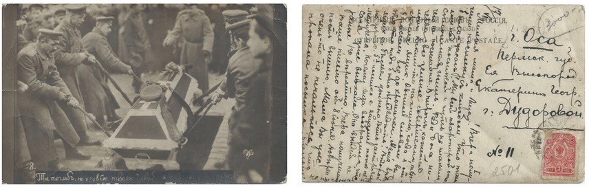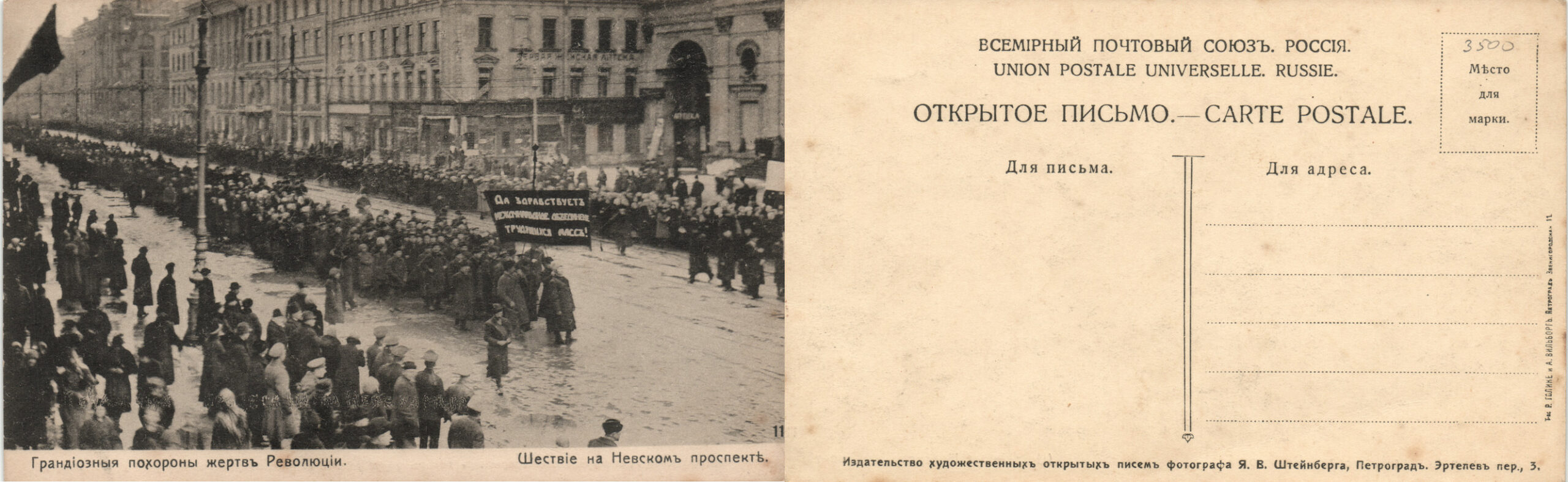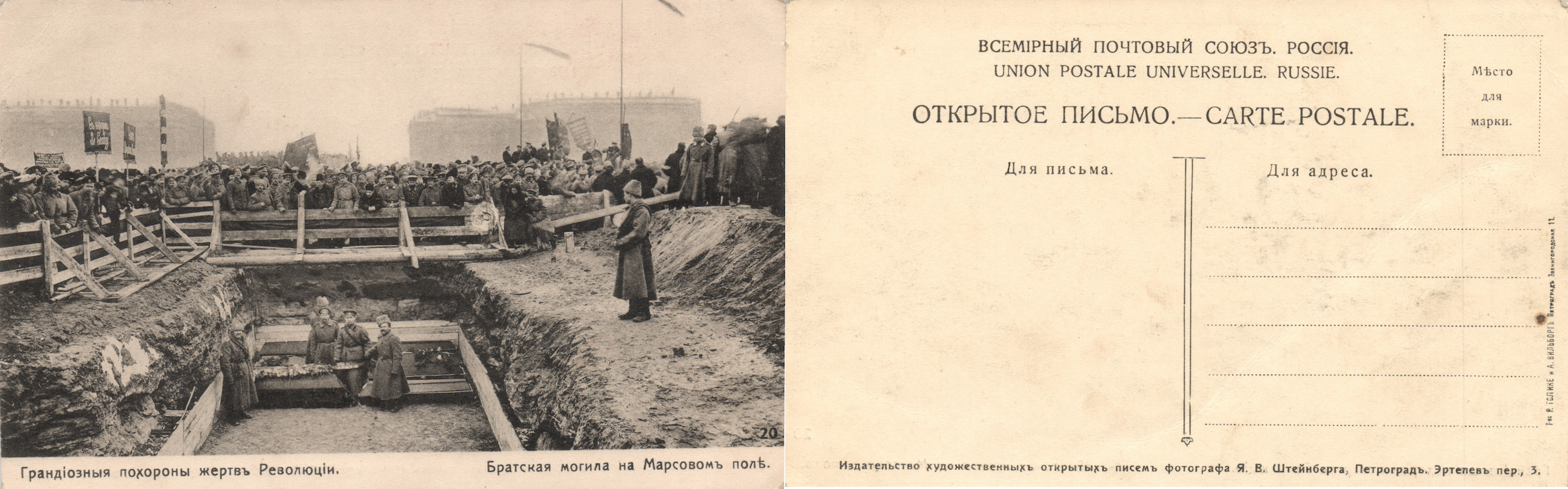Im März dokumentierten Postkarten die Toten und vor allem Prozessionen, welche die Form politischer Kundgebungen annahmen und die Särge zu feierlichen Begräbnissen in Gemeinschaftsgräbern auf dem Marsfeld begleiteten. Im Juli zirkulierten Postkarten mit Begräbnisprozessionen der im Zuge der bolschewistischen Juliaufstandes getöteten Kosaken mit ihren Pferden, und im November solche der (weniger zahlreichen) Opfer der Oktoberrevolution.