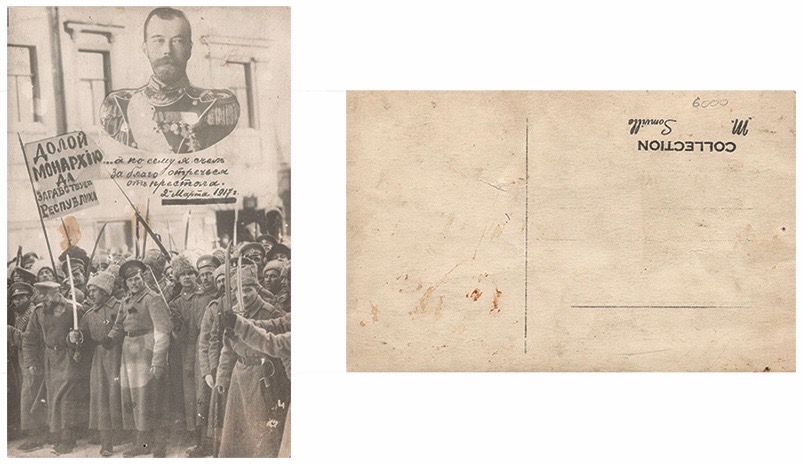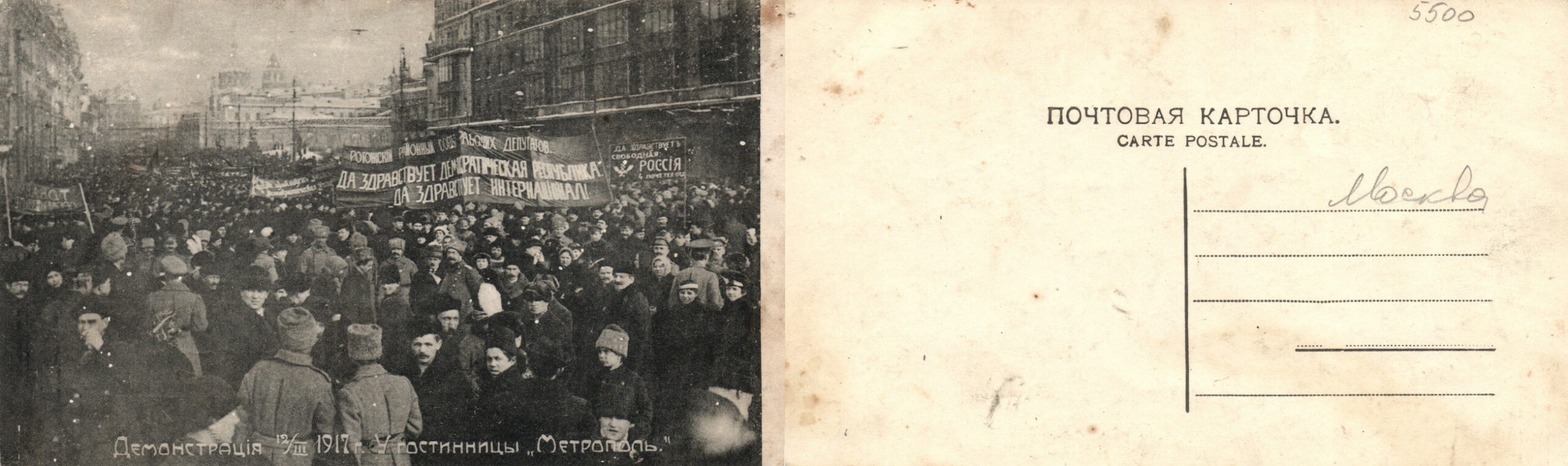 Die zeitgenössischen Postkarten zeigen 1917 als Jahr vielfältiger revolutionärer Ereignisse und Demonstrationen. Nach der Februarrevolution entfiel die Zensur, und Postkarten wurden von einer neuen Vielzahl größerer und kleinerer Hersteller und in- und ausländischer Verlage angeboten. Fotografen dokumentierten die Ereignisse und gaben häufig selbst Postkarten heraus. Teilweise erschienen dieselben Fotografien in der Presse und als Postkarten, auch bei unterschiedlichen Herstellern. Erst Anfang 1918 brachten die Bolschewiki den Markt unter ihre Kontrolle.
