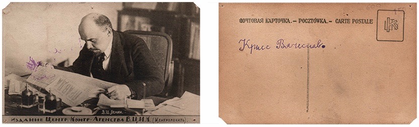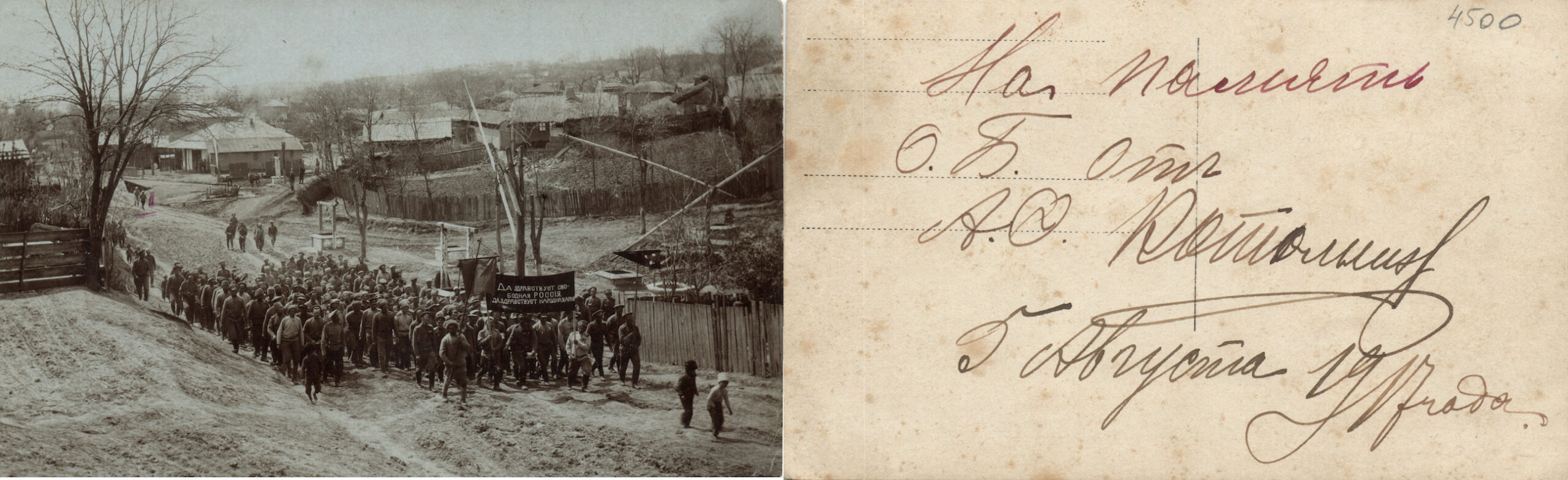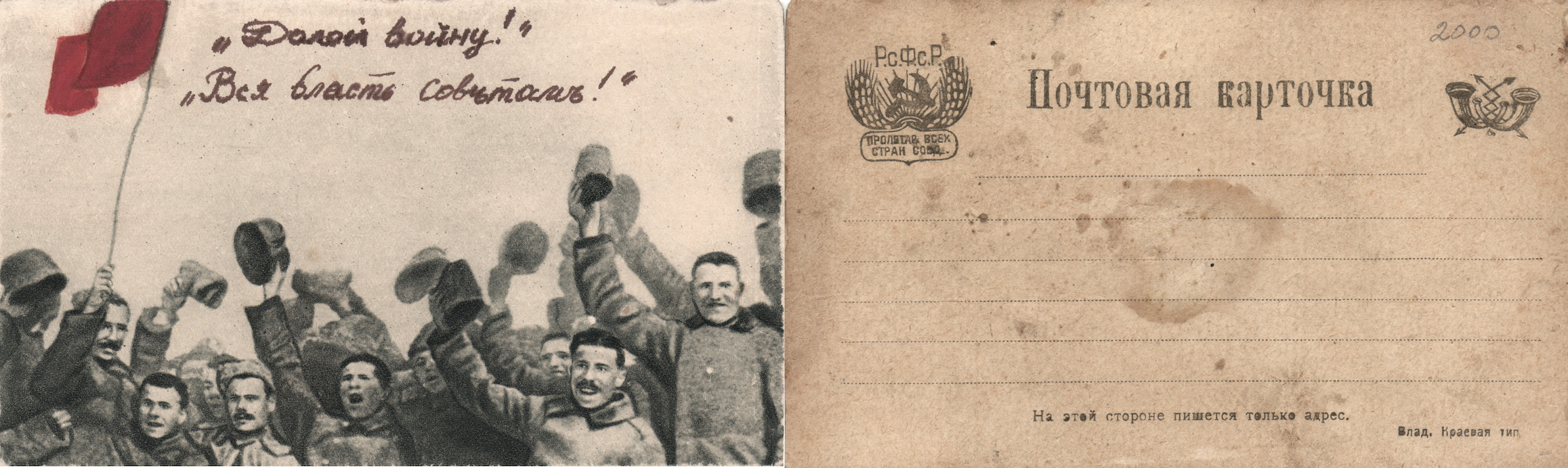 Nach dem Oktoberumsturz nutzen die Bolschewiki die Postkarten als wichtiges Propagandamedium. Hier haben wir es mit einer der ersten solcher Postkarten zu tun. Das Ausscheiden Russlands aus dem Krieg war eines der ersten Dekrete Lenins. Die Postkarte mit den Soldaten, die jubelnd ihre Mützen schwenken dürfte gestellt sein. Die Retusche blendet den Hintergrund aus und malt einem der Soldaten eine leuchtend rote Fahne in die Hand. Die Karte wurde von Hand mit den Losungen „Fort mit dem Krieg“ und „Alle Macht den Sowjets!“ beschriftet. Auf der Adress-Seite sind, als Zeichen der staatlichen Aneignung des Postkarten-Diskurses, das Staatsemblem der RSFSR sowie ein Emblem der Post abgedruckt. Damit wird der offizielle Status der Karte betont. Das alles weist auf eine höhere Auflagenzahl hin.