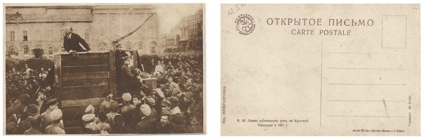 Die Aufnahme von Lenin auf der Rednertribüne aus dem Jahr 1920 hat es aus mehreren Gründen zu einiger Berühmtheit gebracht. Erstens zeigt sie Lenin in einer ikonischen Pose, die Mütze in der Hand, als Redner und aktiven Anführer der revolutionären Massen: Diese erscheinen auf zahlreichen Postkarten des Revolutionsjahres führerlos, hier gelingt nun die visuelle Verbindung der Menschenmenge mit einer visionären Führerpersönlichkeit in idealer Weise. Wegen seiner Ausdrucksstärke wurde das Bild zum Teil der kanonisierten Lenin-Ikonografie. Weil auch die Fotografie häufig reproduziert wurde, fanden mit der Zeit einige Retuschen statt, mit deren Hilfe etwa der in Ungnade gefallene Trotzki von der Treppe entfernt wurde.