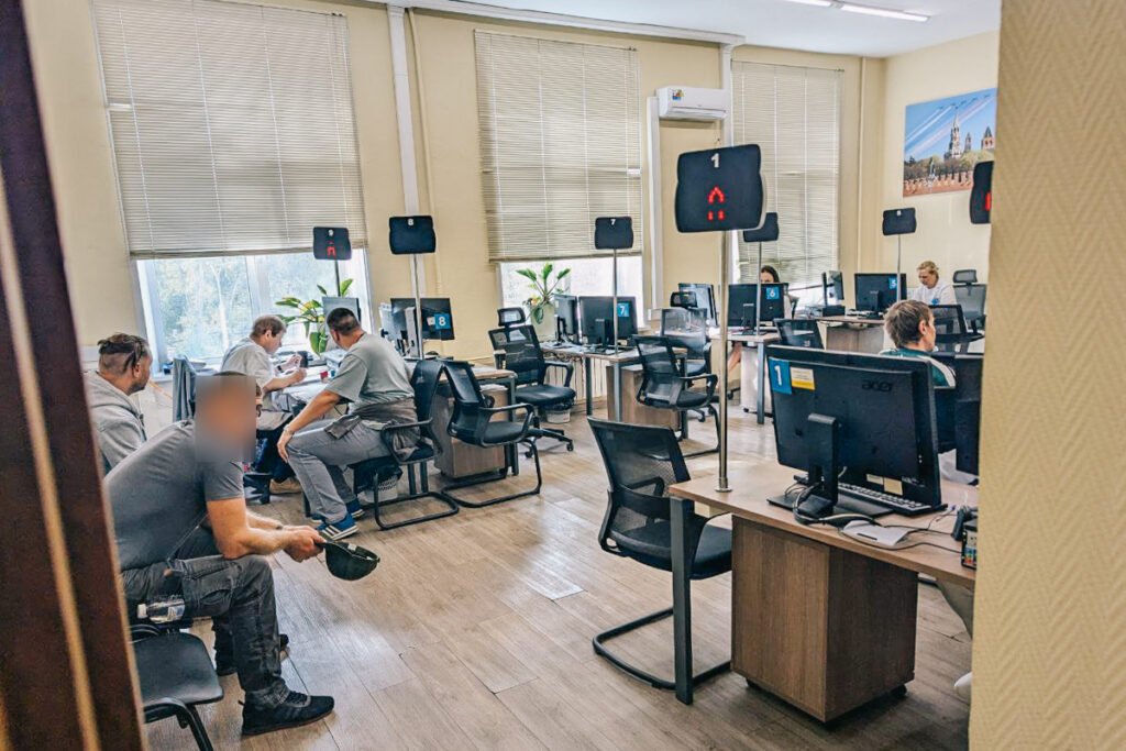 Vor der Türe stehen zwei Polizisten mit Maschinenpistolen. In zwei Glaskästen stehen Schaufensterpuppen in Militäruniform und ohne Gesichter. Ab neun Uhr morgens baut sich die Schlange auf: Als Erste kommen Leute aus entlegenen Regionen zur Rekrutierungsstelle, die mit dem Nachtzug nach Moskau gekommen sind. Drinnen sieht es hier aus wie in einem gewöhnlichen Moskauer Servicezentrum für Bürgerangelegenheiten. Wartenummern werden elektronisch aufgerufen. In den Tagen, als die Reporterin mit Wartenden sprach, waren bereits Nummern kurz vor hundert an der Reihe, dabei war es noch nicht einmal Mittag. Jedes Mal, wenn sie mit Bewerbern sprach, war der Saal voll.