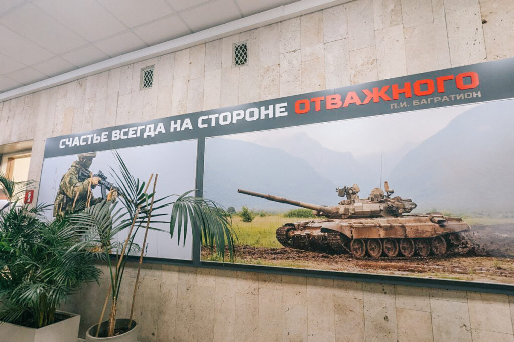 In der Eingangshalle der Rekrutierungsstelle steht ein Automat für Kaffee, Chips und Brause. An den Wänden hängen Plakate: „Je ausgedehnter die Grenzen, desto weiter weg der Feind“ und: „Der Sieg ist nur eine Frage der Zeit! Zögere nicht!“ In der Ecke liegen frische Zeitungen aus. Einer der Gesprächspartner schickte uns das Foto einer Ausgabe von Wetschernjaja Moskwa. Dort war ein Plakat von 1942 abgedruckt, mit einer Leiche unter den Füßen eines sowjetischen Soldaten und der Aufschrift „Das russische Volk wird niemals auf Knien stehen.“