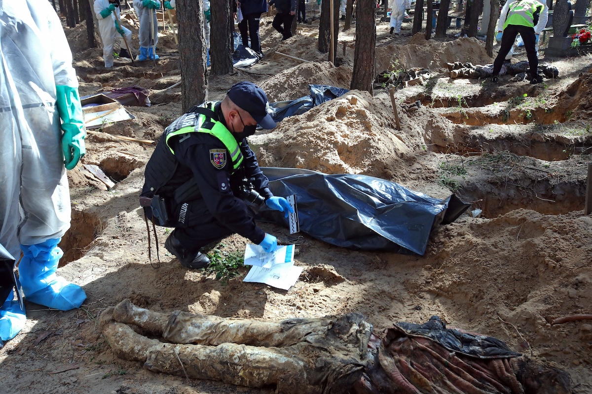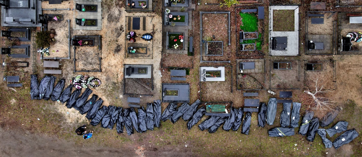 Aufgereiht in Plastiksäcken liegen Opfer willkürlicher Tötungen durch russische Besatzer auf dem Friedhof von Butscha. Ermittler haben sie im April 2022 geborgen, um jedes einzelne Verbrechen nachzuweisen / Foto © IMAGO / ZUMA Press Wire
