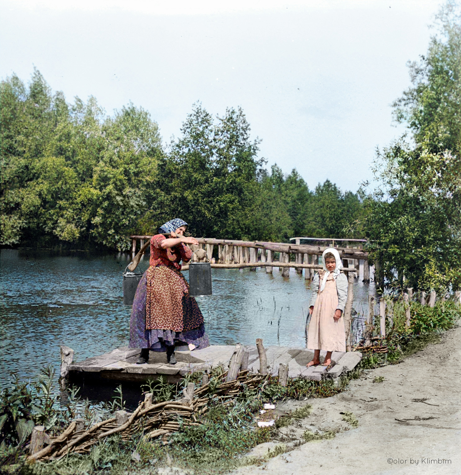 Eine Bäuerin und ein junges Mädchen stehen auf hölzernem Flusssteg. Die Bäuerin schultert ein Tragjoch mit zwei Eimern Wasser, Russland 1900er Jahre / Samuel Hopwood