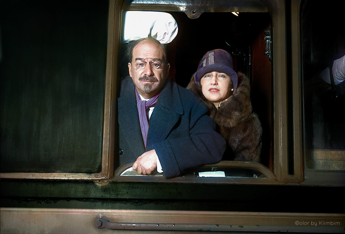 Ein Mann schaut aus einem Zugfenster. Er blickt den Betrachter direkt an, ganz präsent, ernst sieht er aus. Erst auf den zweiten Blick merkt man: Er trägt eine Uniform, eine historische Uniform. Und der Zug … ist auch ein historischer. Und da wird klar: Das ist nicht irgendein Zeitgenosse, das ist Zar Nikolaus II.