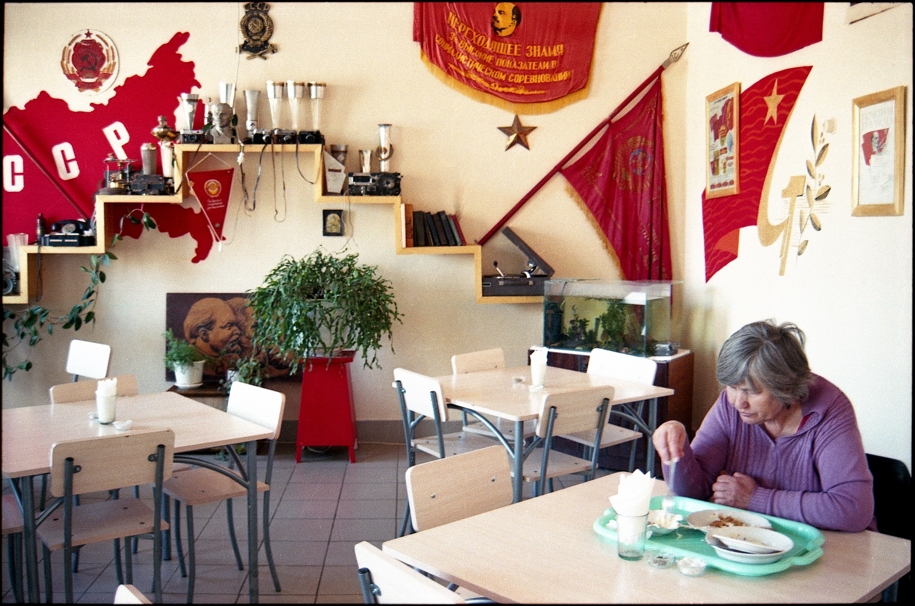 Eine Frau isst zu Mittag in der Stolowka SSSR. Die Kantine lockt Touristen mit ihrem Interieur an: Überall sind sowjetische Artefakte. Für Einheimische hingegen ist diese Kantine ein Ort, an dem man günstig Mittag essen kann / Foto © Michail Kalaraschan