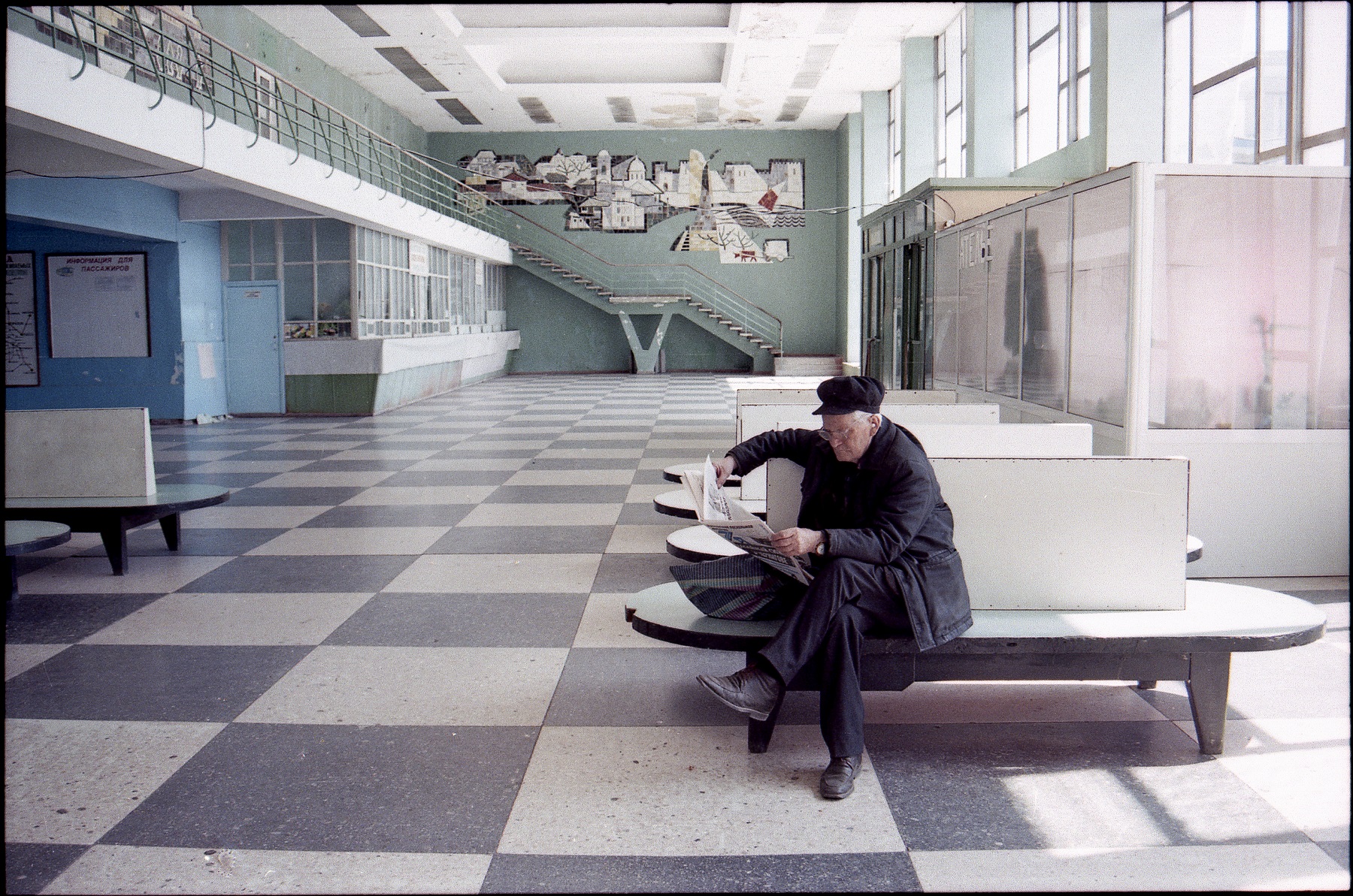 Ein Mann liest Zeitung im Wartesaal des Busbahnhofs von Bender. Im Jahr 2021 wird von diesem Bahnhof nichts mehr übrig sein. Er ist von einem Privatunternehmen aufgekauft worden, und der Innenraum wird komplett erneuert / Foto © Michail Kalaraschan