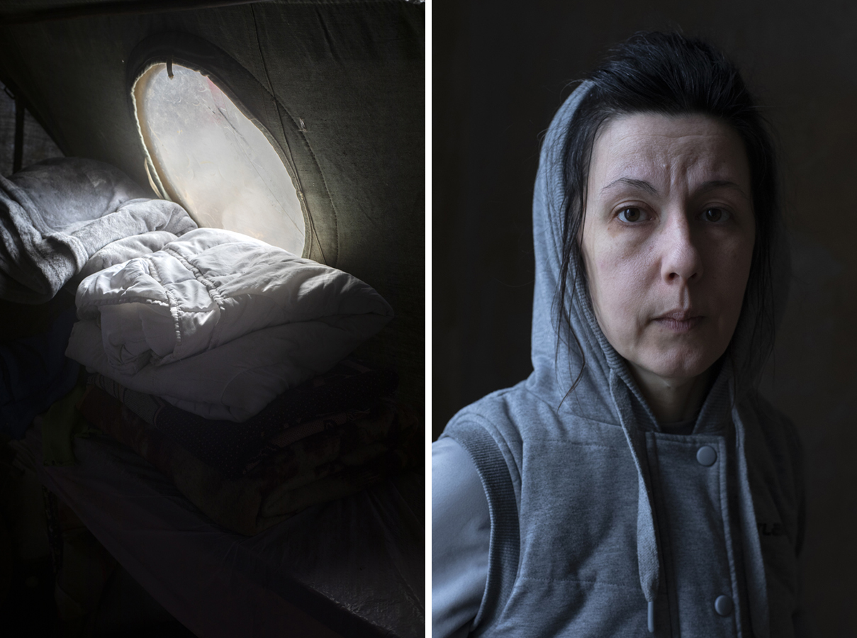 Rechts: Olena aus Charkiw in einem Schutzraum in Lwiw, ein kurzer Zwischenstopp auf ihrem Weg in die EU. Ukraine, April 2022