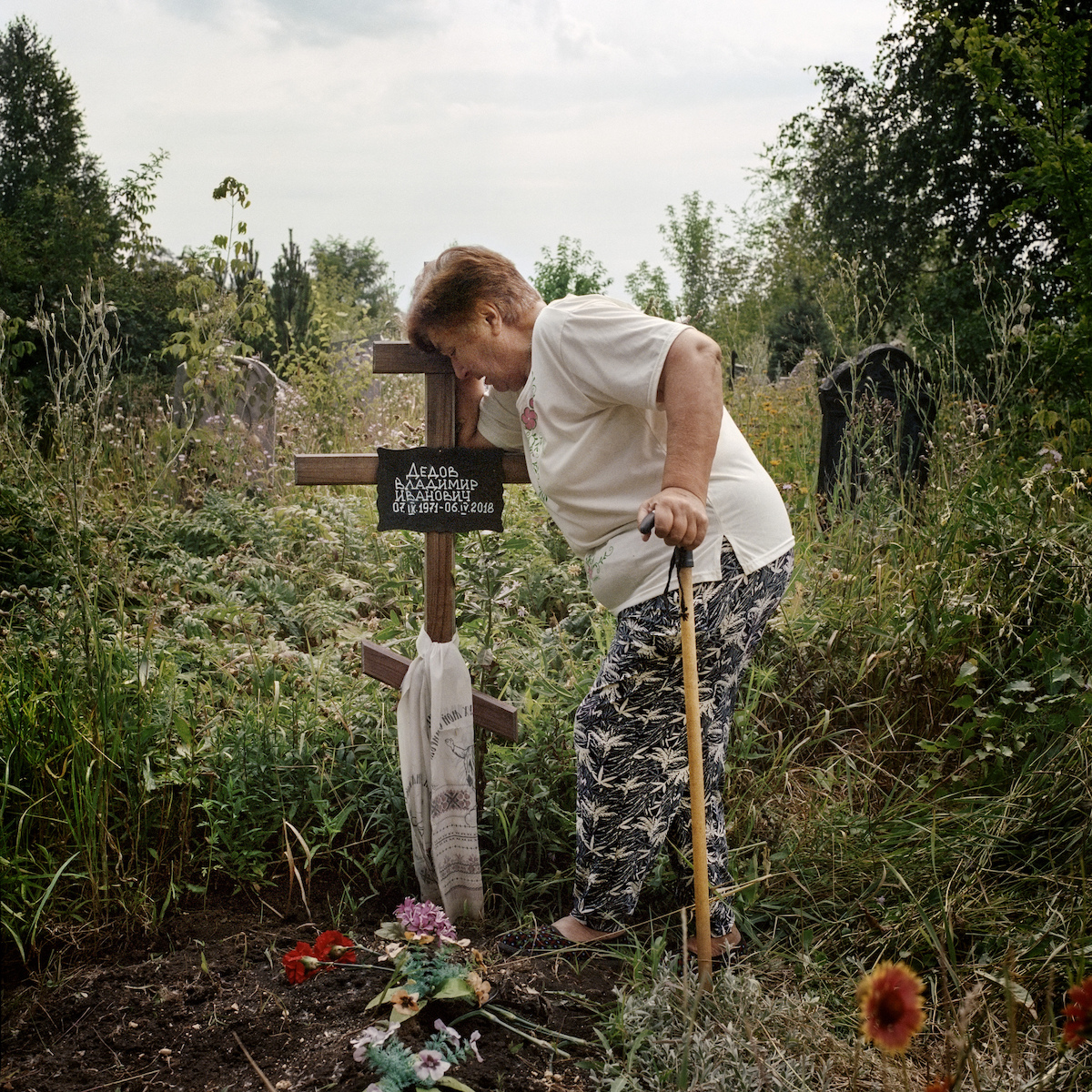 Anna Dedowa, 75, am Grab ihres Sohnes, der sich versehentlich mit einer Handgranate getötet hat, die er in der Nähe seines Hauses in Optyne, einem Dorf in der Region Donezk, gefunden hatte. Dieser Besuch am Grab im Jahr 2019, der von einem dort ansässigen Aktivisten organisiert wurde, ist ein seltenes Ereignis für sie. Denn der Friedhof liegt zwischen Awdijiwka und Donezk und ist wegen der Kämpfe und Landminen kaum zugänglich. Opytne, Juli 2019 / Foto © Anastasia Taylor-Lind