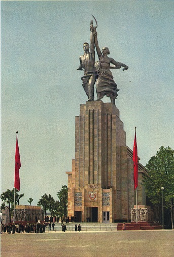 Das Prestigeprojekt entstand auf dem Höhepunkt von Stalins Terrorkampagnen und musste höchsten Ansprüchen genügen. Den Wettbewerb für den Pavillon gewann der Architekt Boris Iofan. Ähnlich wie für den (nie erbauten) Palast der Sowjets in Moskau geplant, sollte auch der Pavillon von einer Kolossalstatue gekrönt werden. Iofan schwebte zunächst als Vorbild die Nike von Samothrake aus dem Louvre vor. Der Pavillon stand jedoch im Zeichen des „Neuen Menschen“3, der in der sowjetischen Ikonographie stets als Paar auftrat.
