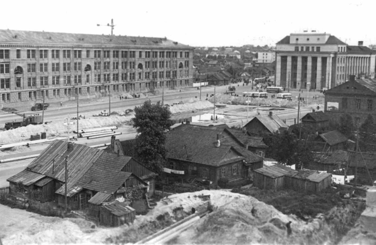 Vorrevolutionäre Gehöfte und die in den 1930er Jahren erbaute Akademie für Körperkultur am Jakub-Kolas-Platz, Minsk 1952 / Foto © BGAKFFD, 0-118044