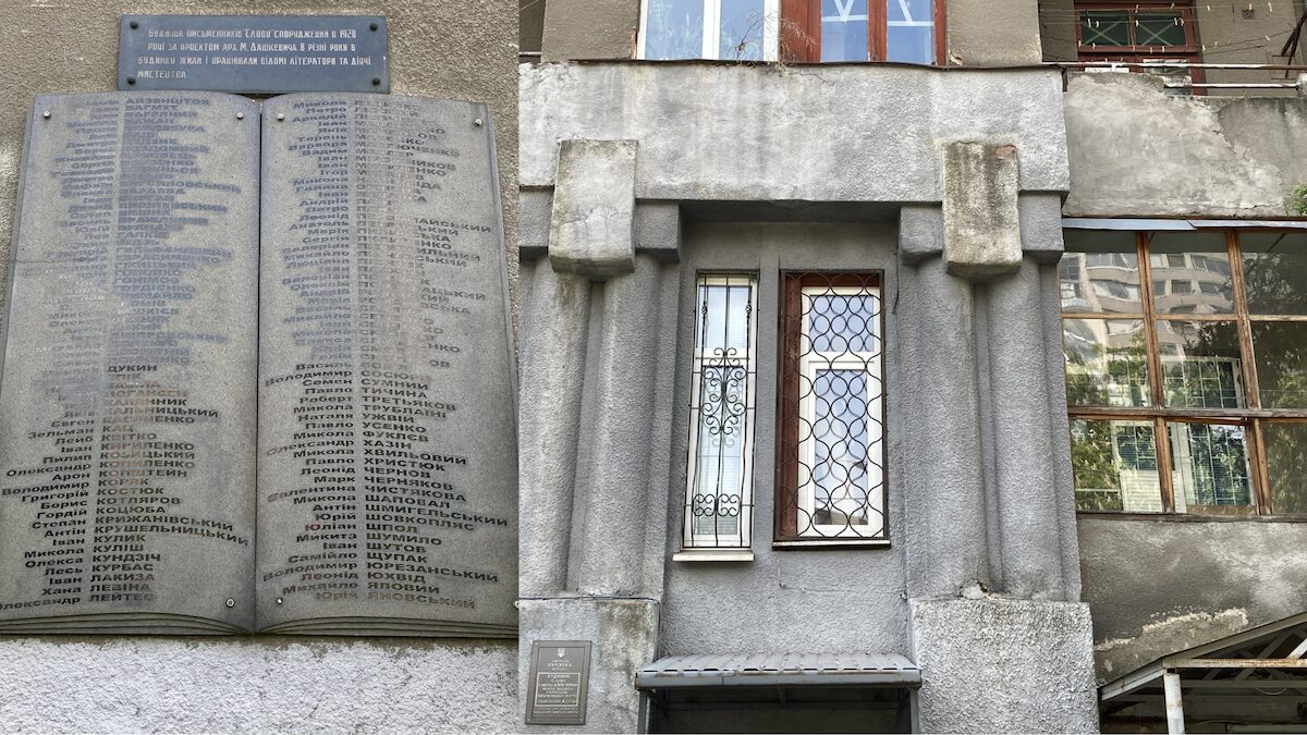 Das Charkiwer Budynok Slowo (dt. Wort-Haus) ist heute ein Wohngebäude mit Gedenktafel für die in den 1930er Jahren repressierten ukrainischen Kunstschaffenden. / Fotos und Collage © Peggy Lohse/dekoder, 05/2024