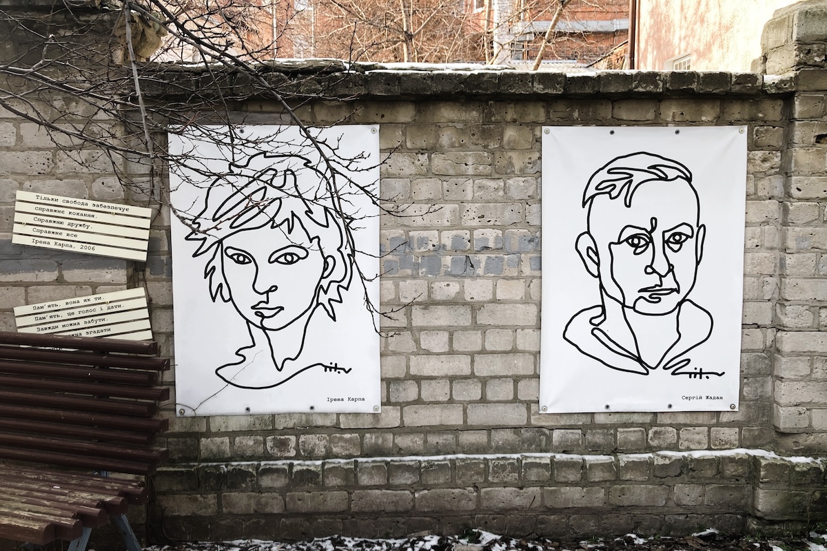 Porträts und Zitate an den Gartenmauern des Charkiwer Literaturmuseums: „Nur die Freiheit garantiert echte Liebe. Echte Freundschaft. Echtes alles“ von Irena Karpa (2006) und „ … Die Erinnerung – sie ist wie du. Erinnerung ist Stimme und Daten. Man kann sie immer vergessen, man kann sich immer erinnern. *Erinnerst du dich? – frage ich*“ von Serhij Zhadan aus „Zhyttja Mariji“ (2015, dt. Marias Leben). / Foto © Peggy Lohse/dekoder, 02/2025