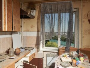 Ein Bücherstapel hat einen russischen Raketenangriff im Charkiwer Plattenbaugebiet Nord-Saltiwka überstanden. / Foto © Peggy Lohse/dekoder, 08/2025