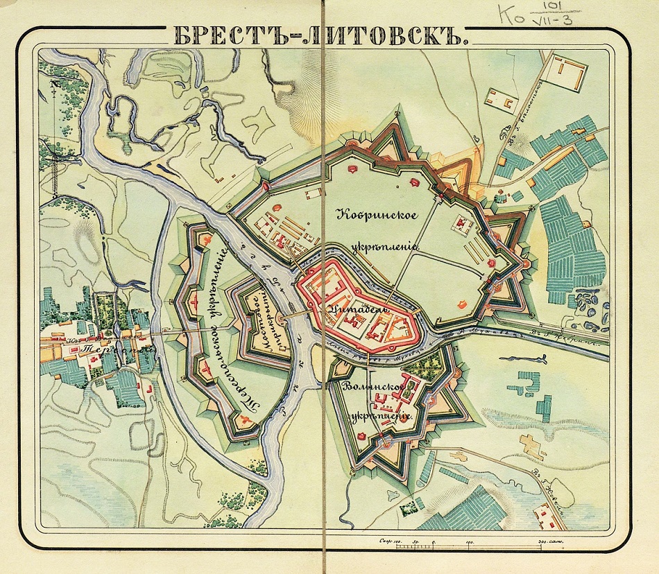 Am Zusammenfluss von Bug und Muchawez entstand im 11. Jahrhundert die Stadt Brest. Unter Zar Nikolaus I. wurde sie in den 1830er Jahren jedoch niedergerissen und etwas weiter östlich neu errichtet. Grund dafür war der Bau einer mächtigen Befestigungsanlage, welche die Grenze des Zarenreiches zu Kongresspolen sichern sollte. Umgeben von den beiden Flüssen sowie künstlich angelegten Gräben liegt die Festung auf vier Inseln mit einer Fläche von etwa vier Quadratkilometern. Die äußeren Inseln wurden mit Erdwällen gesichert, während die Kerninsel von einer zweistöckigen Ringkaserne mit mächtigem Mauerwerk umgeben war.
