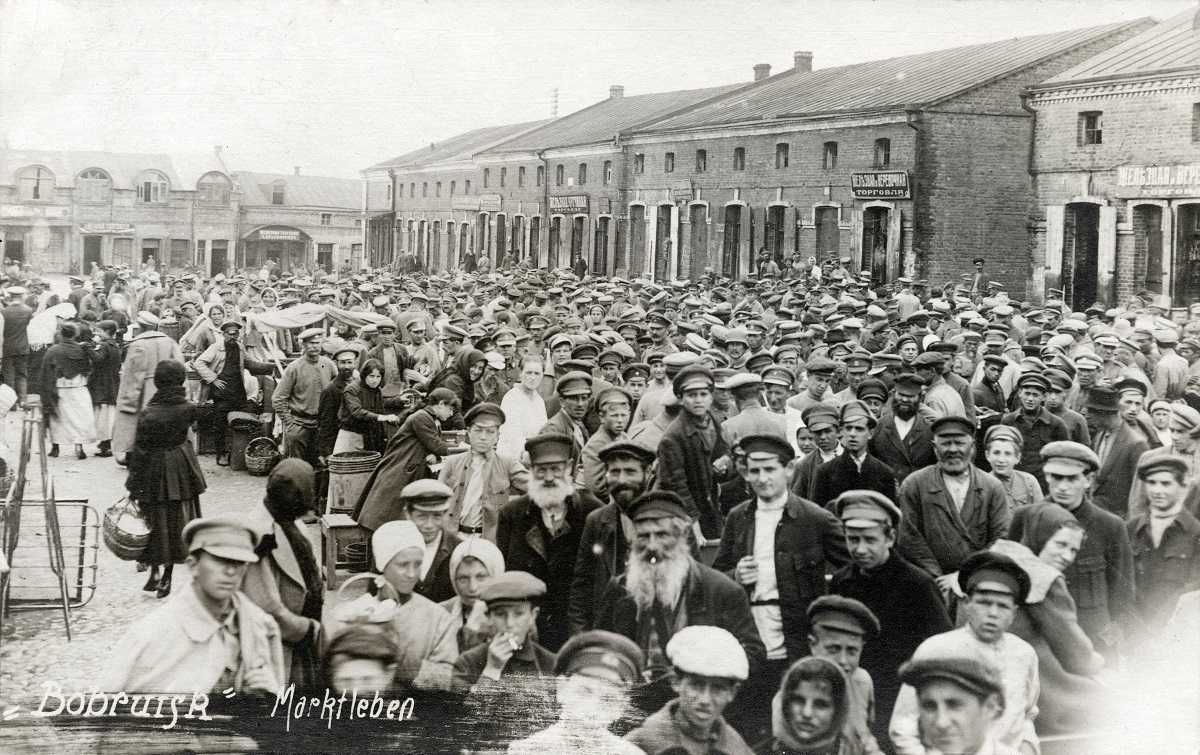 Während des Ersten Weltkriegs wurde vor allem der westliche Teil der heutigen Belarus zum Kriegsschauplatz. Bei den Eliten des Russischen Reichs führte die nationale Kriegsbegeisterung zu Misstrauen gegenüber allen, die nicht als Teil der russischen Nation galten. Auch die Jüd*innen im Ansiedlungsrayon wurden dabei zunehmend als illoyal wahrgenommen, auch wenn viele Juden in der russischen Armee kämpften. Denn aufgrund der jahrhundertealten Ansiedlungsbeschränkungen lebten sie in einem Gebiet, wo sie Kontakt zum Feind aufnehmen konnten. Zahlreiche Russ*innen verdächtigten sie auch aufgrund der dem Deutschen verwandten jiddischen Sprache, für den Kriegsgegner zu spionieren. Deshalb wurden etwa eine Million Jüd*innen gewaltsam und abermals pogromartig aus den zum Russischen Reich gehörigen Frontgebieten vertrieben, darunter auch viele aus den belarusischen Gebieten. Sie lebten nun in bitterer Not als Flüchtlinge in Städten im Inneren des Russischen Reiches, in denen ihnen neue Formen antijüdischer Ressentiments und damit einhergehende Gewalt entgegenschlug.14