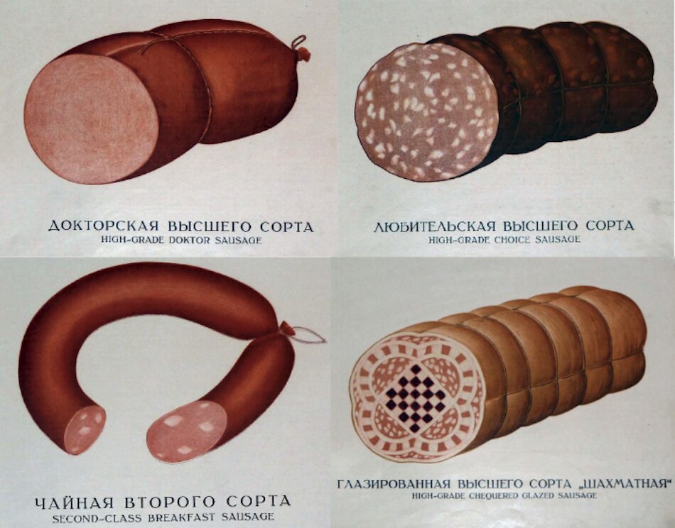 Die verschiedenen sowjetischen Wurstsorten unterschieden sich im Geschmack, Preis und in ihrer Zugänglichkeit für die Bevölkerung. Im Bilderbuch Würste und geräucherte Fleischprodukte, 1938 herausgegeben vom Volkskommissariat für Nahrungsmittelindustrie, findet man über 60 Wurstrezepturen, die sich in die folgenden Zubereitungsarten unterteilen lassen: farschirowannaja (dt. gefüllte), warjonaja (dt. gekochte), koptschоnaja (dt. geräucherte), liwernaja (dt. Leberwurst), krowjanaja (dt. Blutwurst) und noch viele weitere.5 Laut dem vielfach neu aufgelegten und millionenfach verkauften Kniga o wkusnoi i sdorowoi pischtsche (dt. Buch über schmackhafte und gesunde Nahrung) wurden in der UdSSR später über 100 Sorten größerer und kleinerer Würste produziert.