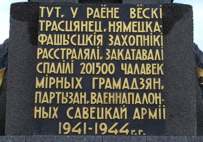 Aufschrift auf dem Mahnmal in Bolschoi Trostenez aus den 1960er Jahren: „Hier, in der Nähe des Dorfes Trostenez folterten, erschossen und verbrannten die deutsch- faschistischen Eroberer von 1941 bis 1944 201.500 Menschen: Zivilisten, Partisanen und sowjetische Kriegsgefangene.“ / Foto © Aliaksandr Dalhouski