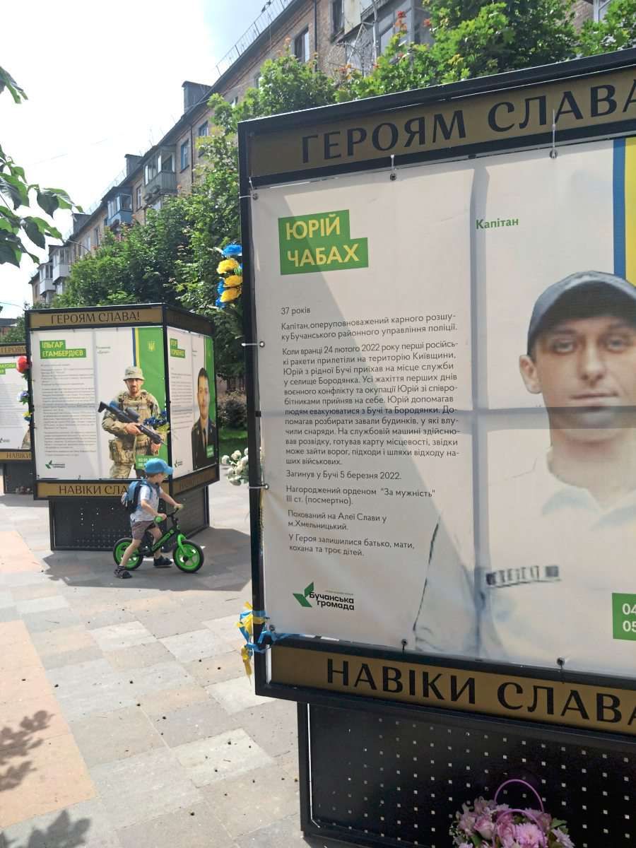 «Их просто слишком много», — произносит Саша и замолкает. Мы в центре Бучи. Здесь, на «Аллее героев», я вглядываюсь в десятки мужских лиц. Первый из них — полицейский Юрий Чабах, который хотел создать отряд дружинников, чтобы противостоять российским захватчикам. Его тело было найдено в массовом захоронении. Ему было 37 лет. Большие плакаты сохраняют память о жителях Бучи, погибших начиная с 2014 года, когда началась война на востоке Украины, и убитых во время оккупации города российскими войсками в марте 2022 года. «Я знаю здесь почти каждого, — рассказывает Саша. — Это у многих так. У нас относительно небольшой город».